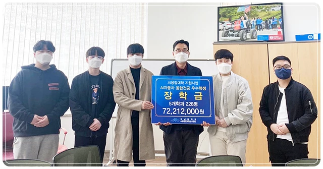 이날 장학금 수여식에는 정영기 사업단장과 미래자동차공학부, 전기공학과, 전자공학과, 컴퓨터공학과, 산업디자인학과 대표 학생이 참석, 5개 학과 228명에게 7,200여만 원의 장학금을 수여하고 AI융합대학 지원사업 관련 질의의 시간을 가졌다.