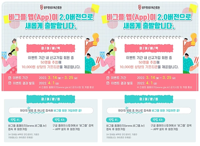 14일부터 오는 25일까지 진행되는 이번 이벤트는 기간 내 ‘비그플’에 접속해 신규로 가입하면 자동으로 응모되며, 추첨을 통해 선정된 50명을 대상으로 1만원 상당의 기프티콘을 제공할 계획이다. 이벤트 결과는 오는 4월 1일 진흥원 홈페이지 공지사항을 통해 게시되며 당첨자에게 개별통보 된다.
