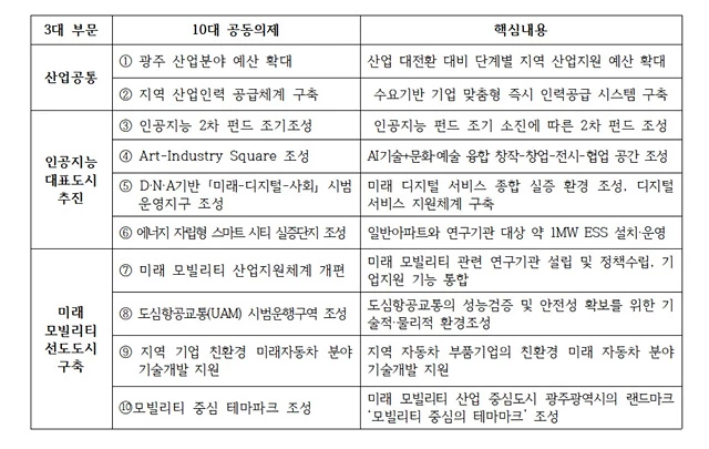 발굴된 3대 부문은 ▲ 산업공통, ▲ 인공지능 대표도시 추진, ▲미래모빌리티 선도도시 구축으로 광주 산업 지원확대, 수요기반 인력공급, 산업 대전환 대응 사업추진이 핵심내용이며 최대 10년간 약 66조원 규모이다.