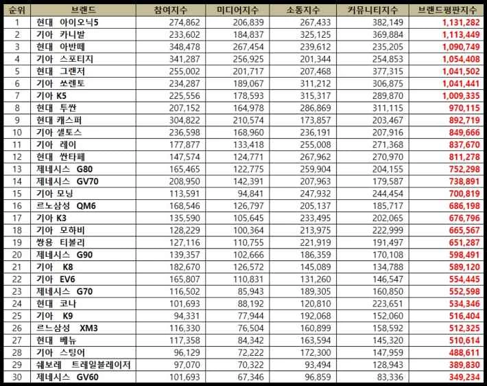 '국산자동차 브랜드평판 3월 빅데이터 분석 30위’ 전체 순위는 아이오닉5, 카니발, 아반떼, 스포티지, 그랜저, 쏘렌토, K5, 투싼, 캐스퍼, 셀토스, 레이, 싼타페, 제네시스 G80, 제네시스 GV70, 모닝, QM6, K3, 모하비, 티볼리, 제네시스 G90, K8, EV6, 제네시스 G70, 코나, K9, XM3, 베뉴, 스팅어, 트레일블레이저, 제네시스 GV60 순으로 분석됐다.