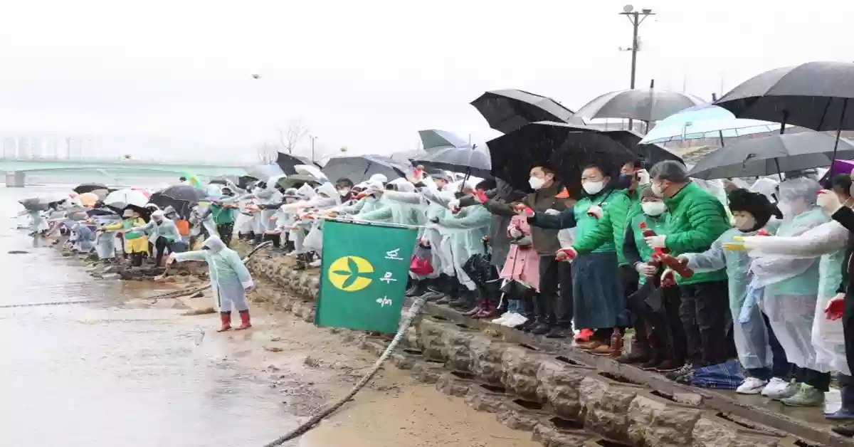 경북 포항시새마을회 형산강 물빛마루에서 EM흙공을 던지고 있는 모습 /포항시 제공