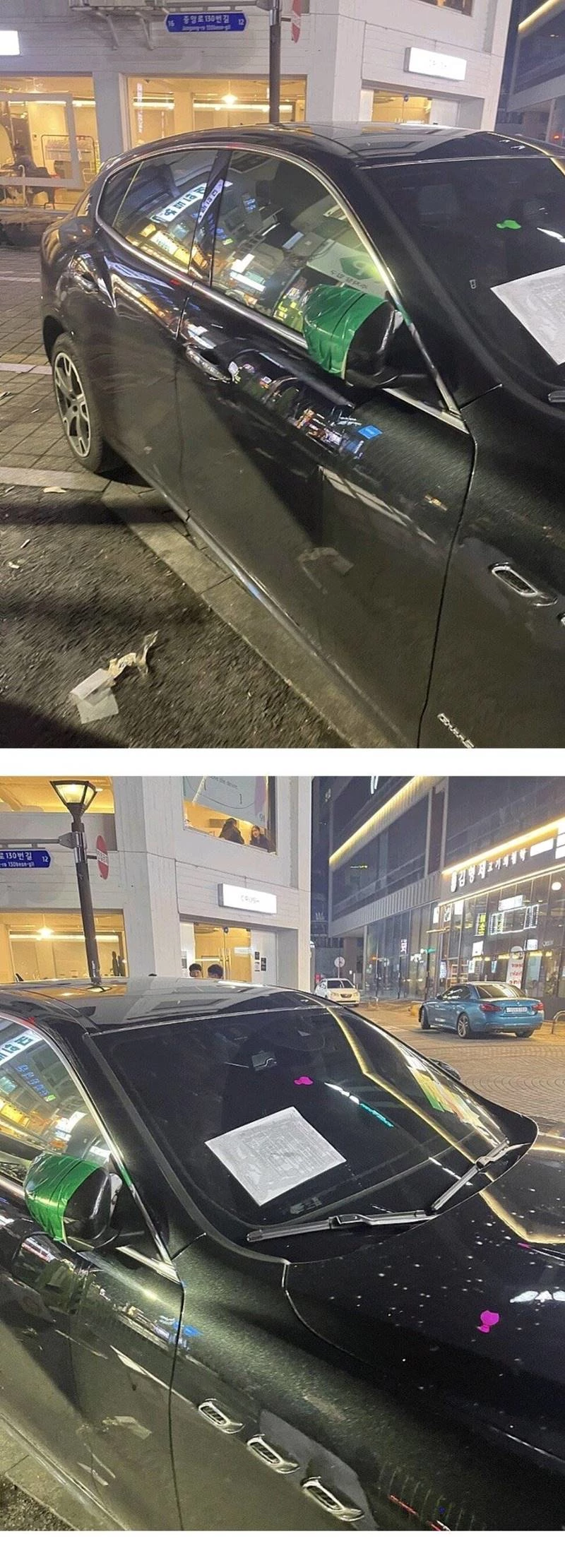 사진을 보면 차주의 사이드미러에 청테이프가 덕지덕지 붙여져 있다. 순간접착제로 보이는 액체 자국이 묻은 앞문도 눈길을 끈다.