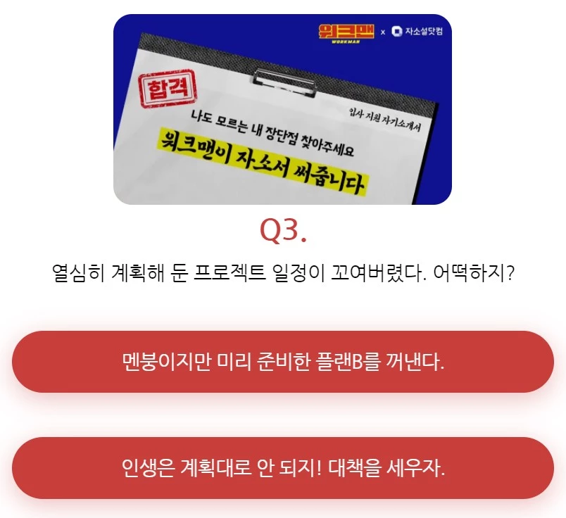 서류 기간을 틈타, 취준생의 이런 현실적인 고민을 간파한 테스트가 공개됐다. 바로 유튜브 채널 ‘워크맨’과 취업 플랫폼 ‘자소설닷컴’이 협업한 테스트형 콘텐츠 ‘자소서 대신 써드립니다’이다.(테스트 사이트)
