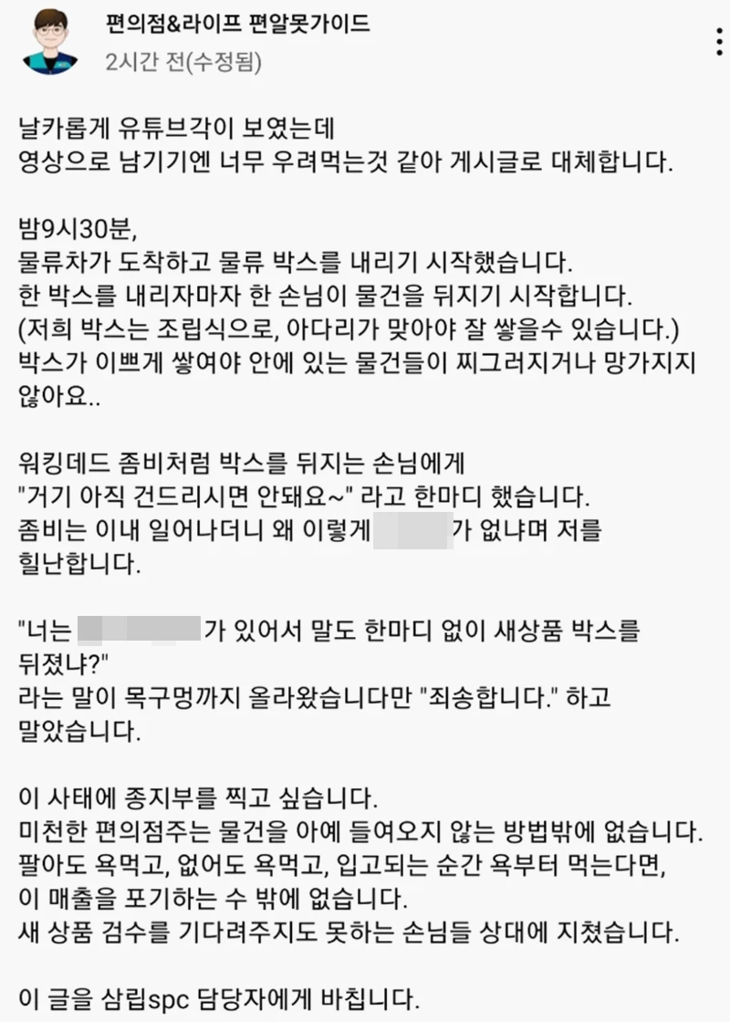 그는 해당 유튜브 커뮤니티에 "밤 9시 30분, 물류 차가 도착하고 물류 박스를 내리기 시작했다. 한 박스를 내리자마자 한 손님이 물건을 뒤지기 시작했다."라며 사건의 배경을 설명했다.