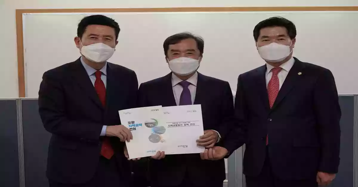 사진 왼쪽부터 경북 포항시 이강덕 시장, 김병준 균형발전특별위원장, 정해종 포항시의장 / 포항시 제공