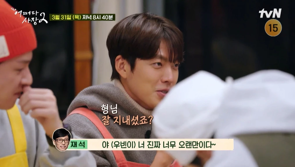 또 김우빈도 함께 있다는 말에 유재석은 "우빈이가 있어?"라고 화들짝 놀라며 "너 진짜 오랜만이다. 광수랑 평소 통화한다는 얘기 들었다"며 근황을 물었다.