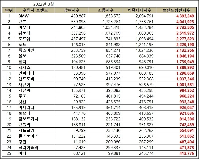2022년 '3월 수입차 브랜드평판' 25위까지 전체 순위는 BMW, 벤츠, 아우디, 쉐보레, 포르쉐, 포드, 폭스바겐, 볼보, 혼다, 렉서스, 인피니티, 랜드로버, 재규어, 캐딜락, 푸조, 닛산, 마세라티, 토요타, 람보르기니, 벤틀리, 시트로엥, 롤스로이스, 링컨, 크라이슬러, 미니 순으로 나타났다.