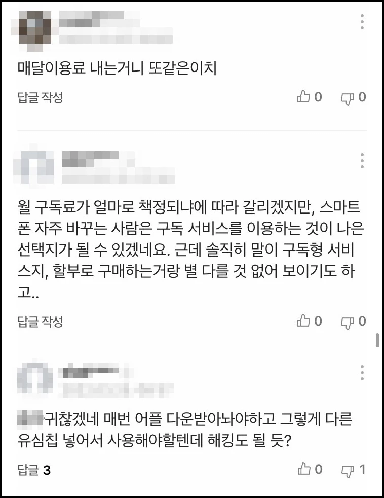 네티즌들의 반응은 엇갈렸다. 몇몇 네티즌들은 "너무 귀찮을 것 같다", "지금도 비슷한 서비스는 있다", "가격만 오르는 것 아니냐"라는 부정적인 반응을 보였다. 하지만 일부 네티즌들은 "스마트폰을 자주 바꾸는 사람은 구독 서비스를 이용하는 것도 좋을 것 같다"라는 댓글을 달기도 했다.