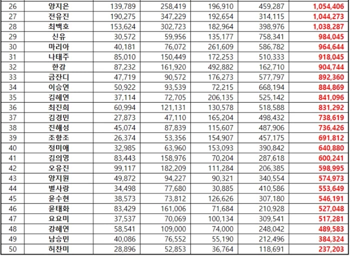 다음은 '3월 트로트 가수 브랜드평판' 1위부터 50위까지 정리한 표다.