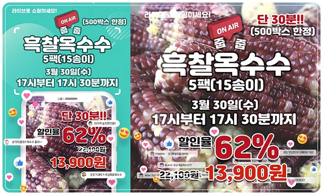 오는 3월 30일 남도장터와 옥과농협이 네이버 쇼핑 라이브를 통해 곡성 흑찰 옥수수를 62% 할인된 가격에 선보인다.