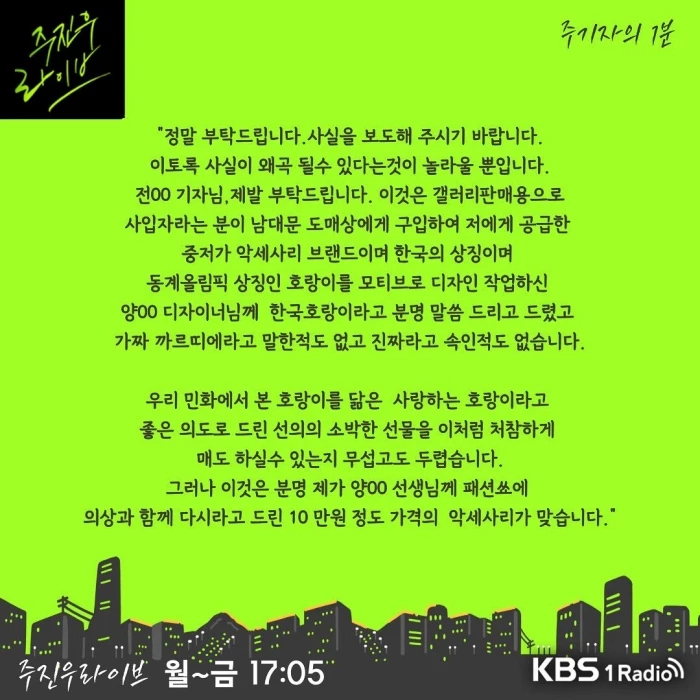 그는 이어 "좋은 의도로 드린 선의의 소박한 선물을 이처럼 처참하게 매도할 수 있는지 무섭고 두렵다"라며 "그러나 이것은 분명 제가 양 선생님에게 패션쇼에 의상과 함께 달라고 드린 10만 원 정도의 액세서리가 맞다"라고 말했다.