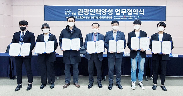 호남대학교 관광경영학과 학생회(회장 주은석)는 3월 31일 전남대학교 광주은행홀에서 광주·전남 관광기관 및 협회, 광주전남지역혁신플랫폼 자율과제 관광분야 참여대학(호남대, 광주여대, 동신대, 광주대)들과 2022 광주·전남 관광인력 양성 업무협약을 체결했다.