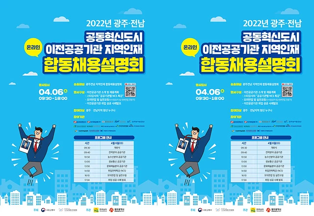 전남도는 6일 오전 9시 30분부터 오후 6시까지 나주에 있는 전남도농업기술원 청년창농타운에서 ‘2022년도 광주·전남 공동혁신도시 이전공공기관 지역인재 온라인 합동채용설명회’를 개최한다고 밝혔다.