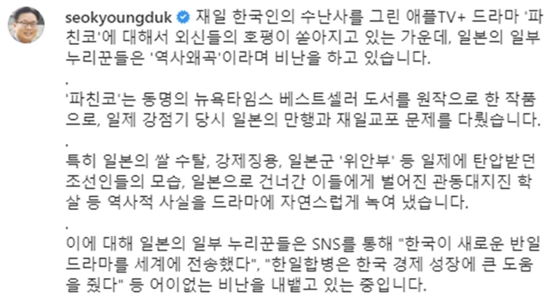 서경덕 성신여대 교수는 4일 자신의 인스타그램을 통해 "재일 한국인의 수난사를 그린 애플+ 드라마 '파친코'에 대해서 외신의 호평이 쏟아지고 있는 가운데, 일본의 일부 누리꾼들이 '역사 왜곡'이라며 비난을 하고 있다"라며 이야기를 시작했다.