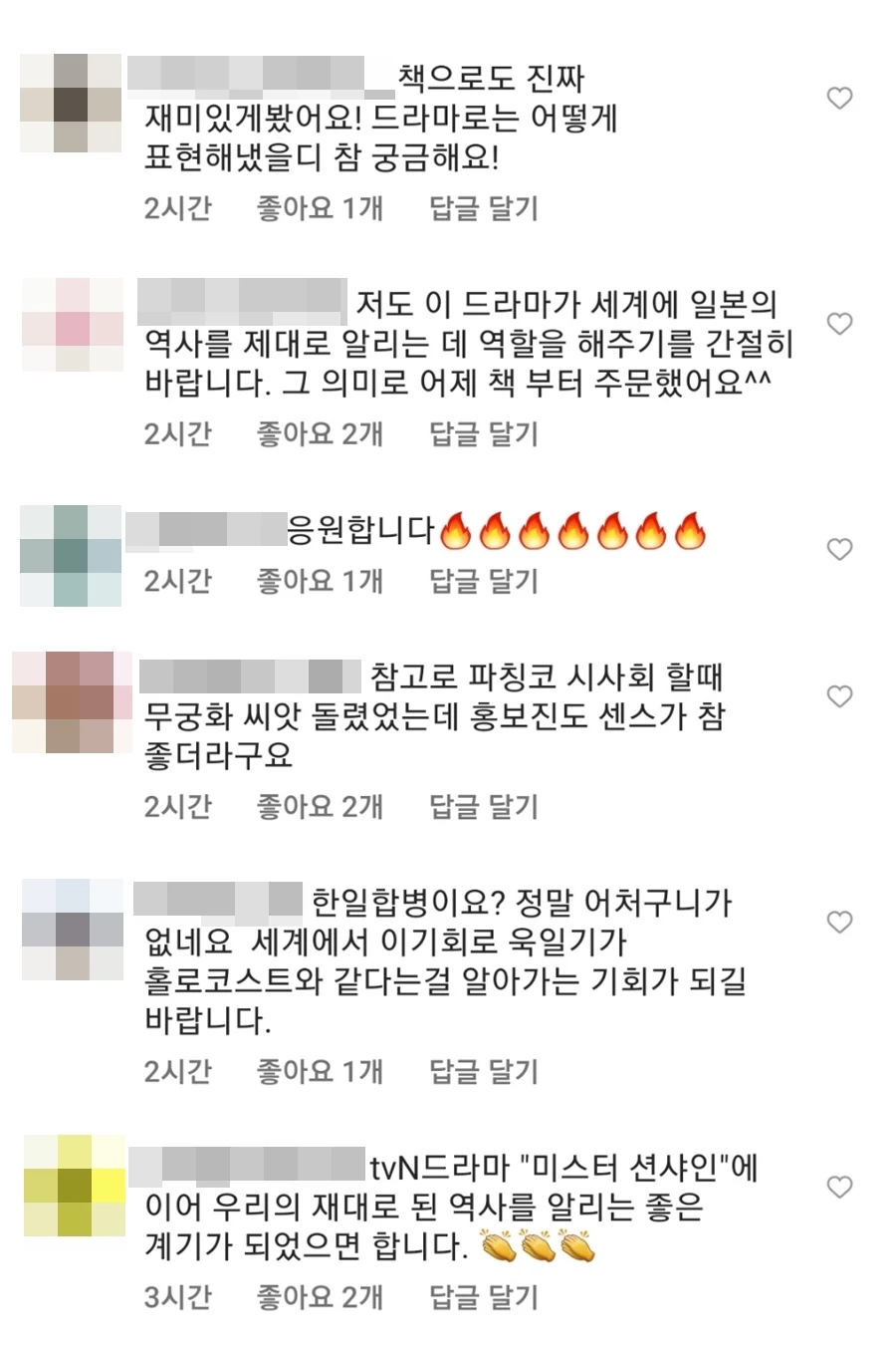 소식을 접한 네티즌들은 서 교수의 인스타그램 댓글을 통해 "이 드라마가 세계에 일본의 역사를 제대로 알리는 역할을 해주기를 간절히 바라고 있다", "시사회 할 때 무궁화 씨앗을 돌렸는데 센스가 좋은 거 같다", "tvN 드라마 미스터 선샤인에 이어 우리가 제대로 된 역사를 알리는 좋은 계기가 됐으면 한다" 등 다양한 의견을 내놓았다.