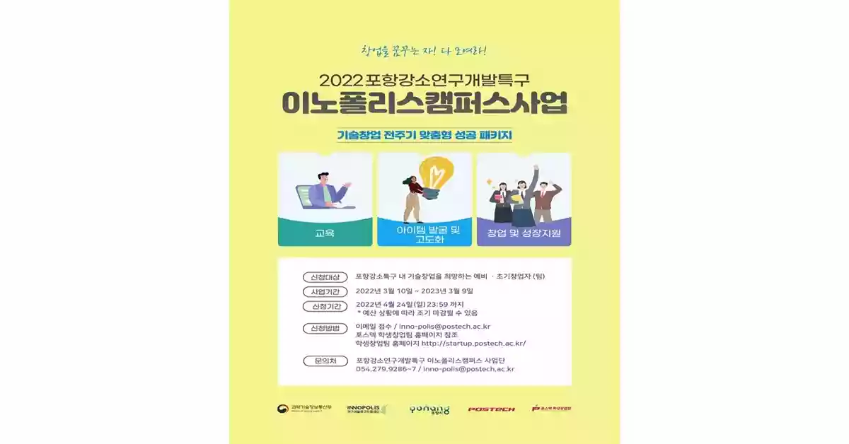 POSTECH(포항공과대학교・총장 김무환) 산학협력단(단장 김상우 교수)은 오는 24일까지 포항강소연구 개발특구 이노폴리스캠퍼스 사업에 참여할 예비창업자를 모집한다.