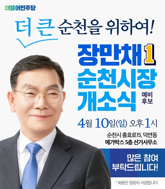 장만채 순천시장 예비후보는 “오는 10일 오후 1시 순천시 충효로15(덕연동) 메가박스 5층에서 선거사무소 개소식을 가질 예정”이라고 5일 밝혔다.