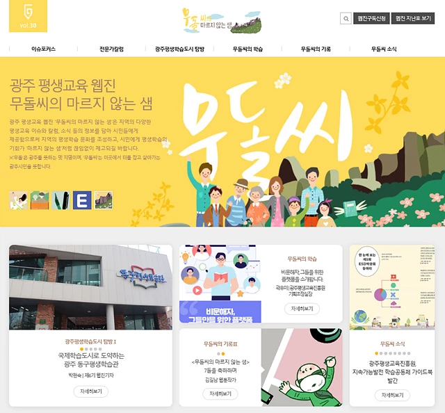 (재)광주평생교육진흥원(원장 김이겸, 이하 ‘진흥원’)은 최근 평생학습 문화 확산을 위한 웹진 「무돌씨의 마르지 않는 샘」 30호를 발간했다고 밝혔다. 올해로 창간 7주년을 맞이한 웹진은 격월로 발행되며 전국 6천여 명의 독자가 구독중이다.