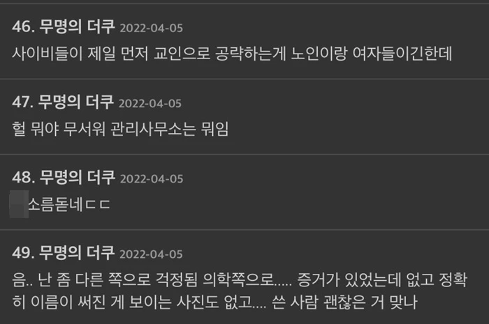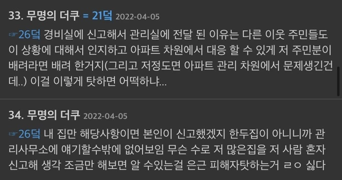 그러면서 그는 "증거가 될 수 있으니 낙서는 지우지 말고 경찰에 신고 조치를 요청했고, 경비실에서도 관리사무소에 전달하겠다고 했다. 그런데 관리사무소에서 자치회장님께 따로 보고하지 않았으며(4월 5일 화요일 통화 확인, 기록 있음) 심지어 112동 이름 낙서를 지운 것을 확인했다(112동 총 4개 층, 모두 이름 적혀 있었다)"며 관리사무소의 대처를 비판했다.