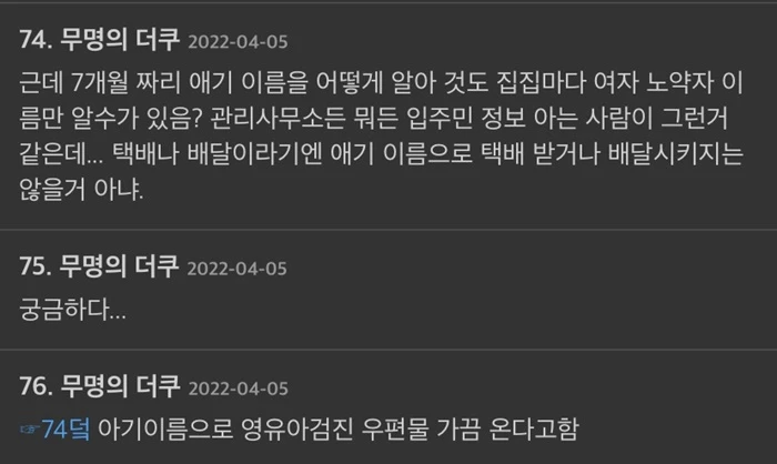 그는 "2층부터 각 세대 앞 소화전에 입주민 성함이 적혀 있었으며 확인 가능한 각 세대에 요청해서 (입주민)이름을 대조한 결과 현재 거주하고 있는 입주민의 이름과 동일했다"며 "특이점은 남성의 이름은 매우 적었으며 주로 여성 및 자녀, 노약자 이름이 적혀 있었다"고 직접 확인한 결과를 공개했다.