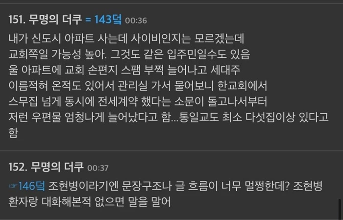 이에 온라인 커뮤니티의 네티즌들도 갑론을박을 벌이고 있다. 온라인 커뮤니티 '더쿠'의 네티즌들은 "영화 '숨바꼭질'도 실화 바탕이었다", "집값 떨어질까 봐 덮으려고 하는 거 아니냐", "내 집만 그랬으면 본인이 신고했을 거다. 한두 집이 아니니까 관리사무소에 얘기할 수밖에 없었을 것이다. 무슨 수로 저 많은 집을 혼자 신고하냐. 피해자 탓하지 마라", "교회 쪽일 가능성 높다"며 갑론을박을 벌였다.