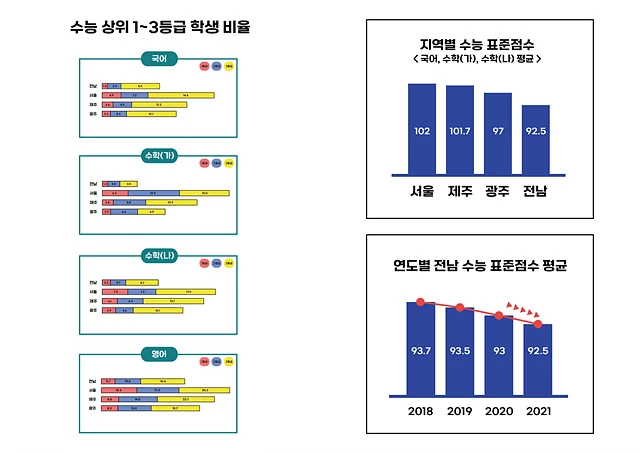 한국교육과정평가원이 공개한 2021학년도 수능 결과에 따르면 전남은 17개 시도교육청 중 국어는 16위, 수학가는 17위, 수학나는 16위를 기록하며 사실상 전국 최하위의 성적표를 받았다. 전남의 표준점수 평균(국어, 수학가, 수학나)은 92.5점으로, 서울 102.0, 제주 101.7, 광주 97.0에 비해 크게 떨어진다.