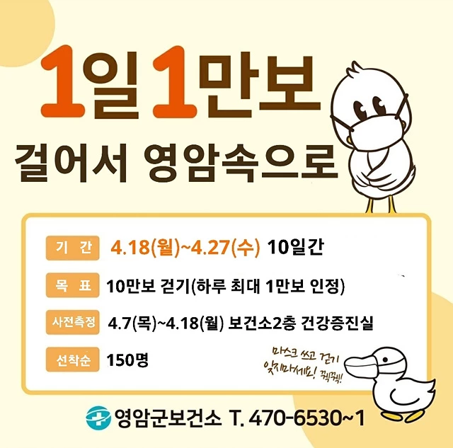 참여자들에게는 올바른 건강 습관을 형성할 수 있도록 건강정보를 제공해주며 ‘걸어서 영암속으로 챌린지’ 1회(4월18일~27일)는 10일 동안 총 10만 보를 달성한 참여자에게 쿠폰제 선착순 150명에게 소정의 상품을 증정할 예정이다.