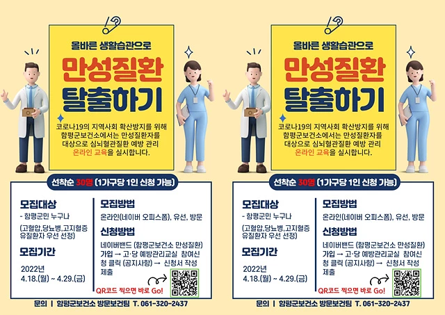 참여를 희망하는 군민은 4월 18일부터 29일까지 네이버밴드(함평군보건소 만성질환)를 통해 온라인 또는 보건소 방문보건팀으로 전화, 방문해 신청할 수 있다.