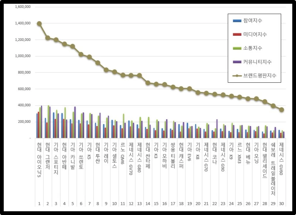 한편 '4월 국산자동차 브랜드평판' 상위 30위에는 아이오닉5, 그랜저, 스포티지, 아반떼, 카니발, 쏘렌토, K5, 투싼, 레이, 셀토스, QM6, GV70, G80, 싼타페, K3, 모하비, 티볼리, 캐스퍼, EV6, K8, G70, 코나, G90, K9, XM3, 베뉴, 모닝, 팰리세이드, 트레일블레이저, 제네시스 GV60이 이름을 올렸다.