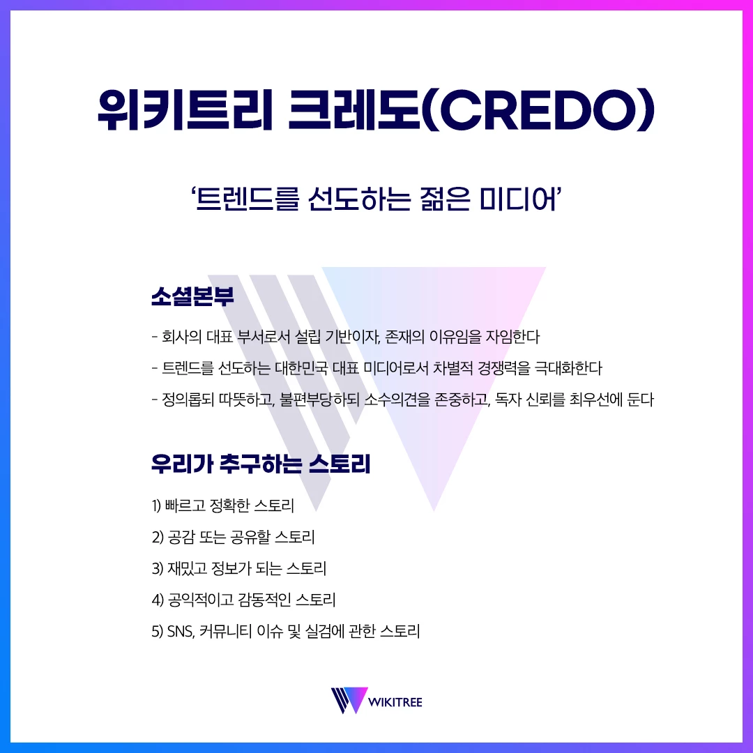 무엇보다 '트렌드를 선도하는 젊은 미디어'라는 위키트리 크레도에 맞게 실시간으로 핫한 이슈들을 가장 먼저 알려드리기 위해 노력하고 있습니다.