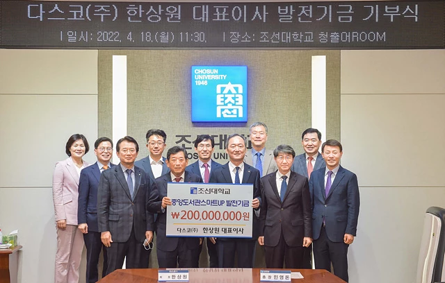 18일 조선대학교 본관에서 열린 기부식에는 조선대학교 민영돈 총장과 다스코㈜ 한상원 대표이사, 한남철 사장, 김택관 본부장이 참석했으며, 조선대학교 정진철 대학원장, 조승제 경상대학장, 임성철 중앙도서관장을 비롯해 대학 및 기관 관계자 등이 참석했다.
