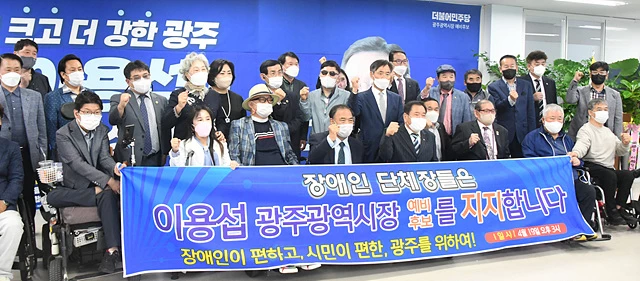 광주지역 90개 장애인단체 대표는 19일 이용섭 광주광역시장 예비후보 선거사무소에서 이용섭 예비후보만이 “장애인이 편하고 광주시민 모두가 행복한 광주를 만들 수 있는 최고의 적임자!”라며 공개지지를 선언했다.