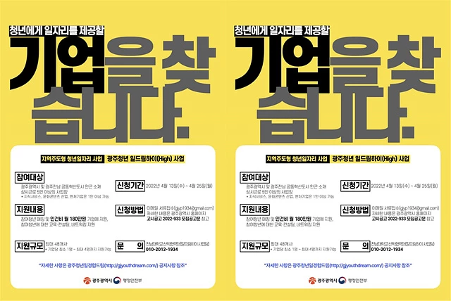 광주광역시는 오는 25일까지 ‘광주청년 일드림하이(High) 사업’에 참여할 사업장 48곳을 모집한다.