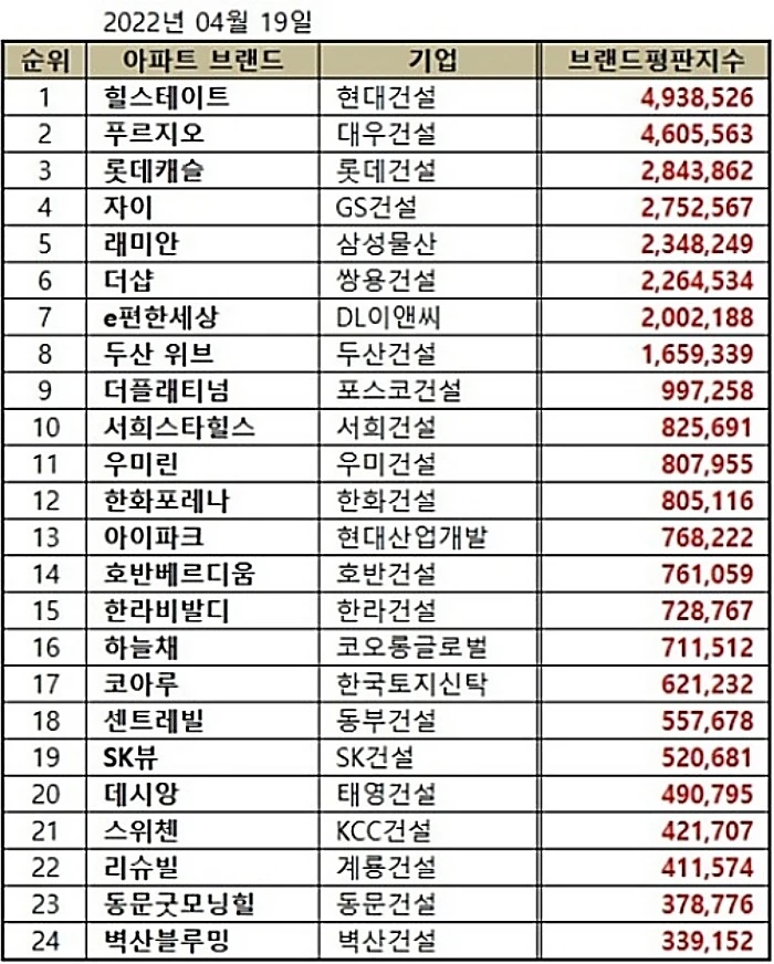 2022년 '4월 국내 아파트 브랜드평판' 24위까지 전체 순위는 힐스테이트, 푸르지오, 롯데캐슬, 자이, 래미안, 더샵, e편한세상, 두산 위브, 더플래티넘, 서희스타힐스, 우미린, 한화포레나, 아이파크, 호반베르디움, 한라비발디, 하늘채, 코아루, 센트레빌, SK뷰, 데시앙, 스위첸, 리슈빌, 동문굿모닝힐, 벽산블루밍 순으로 나타났다.