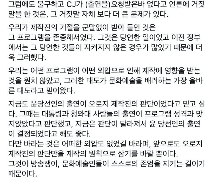 이어 “우리가 제작진의 거절을 군말 없이 받아들인 것은 그 프로그램을 존중해서였다. 그것은 당연한 일이었고 이전 정부에서는 그 당연한 것들이 지켜지지 않은 경우가 많았기 때문이다. 우리는 어떤 프로그램이 어떤 외압으로 인해 제작에 영향을 받는 것을 원치 않았고, 그러한 태도가 문화예술을 배려하는 것이라고 생각했다"고 밝혔다.