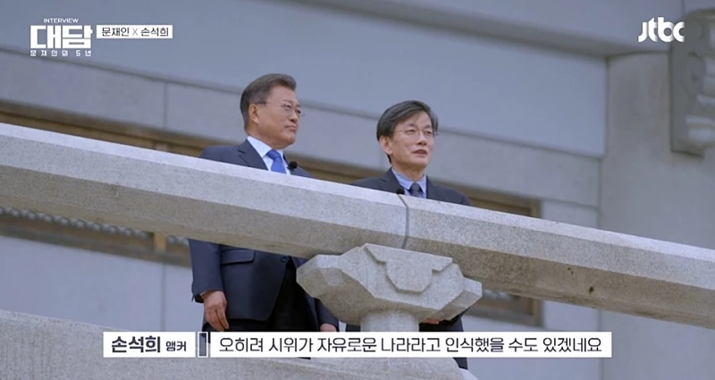 지난 25일 오후 8시 50분 JTBC와 청와대 유튜브를 통해 문 대통령과 손석희 전 JTBC 앵커의 특별 대담이 공개됐다. 이날 80분간 1부가 전파를 탔고, 나머지 2부는 26일 같은 시간에 공개된다.