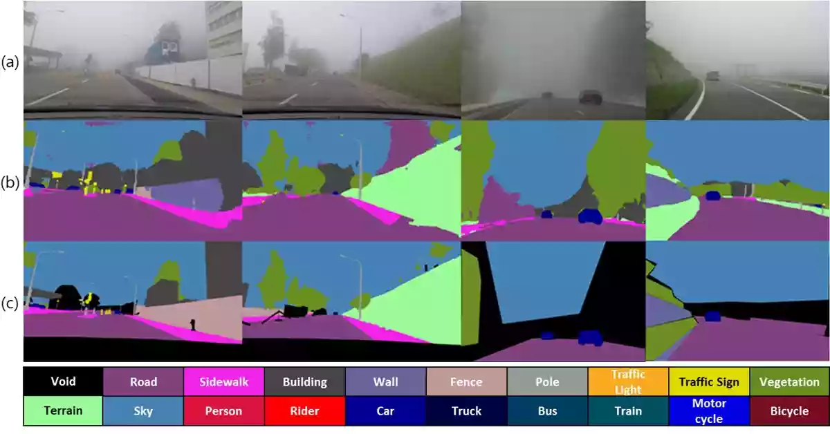 <그림> 제안하는 기술의 정성적 결과 (a) 안개 낀 입력 영상 (b) 제안하는 기술의 의미적 분할 결과 (c) 의미적 분할 정답 / POSTECH 제공