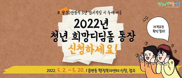 전남 나주시는 지역 청년들의 미래 준비와 안정적 자산 형성을 위한 2022년도 ‘청년 희망 디딤돌 통장’ 사업 신청자를 내달 2일부터 20일까지 모집한다고 28일 밝혔다.