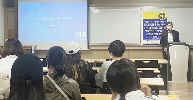 AI융합대학 지원사업의 일환으로 진행된 이날 강연에서 문정환 강사는 미국 내 스타트업 동향, 자율주행 전기자동차 분야의 미국 내 취업 방향 및 전략, 미국 내 UX/UI 디자인 동향 등을 소개했다.