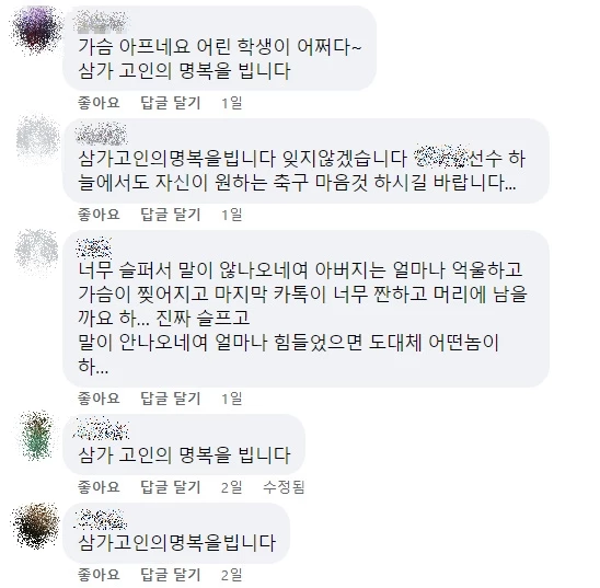 어린 선수의 가슴 아픈 비보에 네티즌들들 추모도 이어졌다. "가슴 아프네요. 어린 학생이 어쩌다가... 삼가 고인의 명복을 빕니다", "잊지 않겠습니다. 하늘에서도 좋아하는 축구 마음껏 하시길 바랍니다", "너무 슬퍼서 말이 안 나오네요", "너무 안타깝네요. 국가대표도 하고 해외 리그에서 뛰고 싶은 마음도 컸을 텐데 하늘의 별이 되다니..." 등 댓글을 남기며 애도했다.
