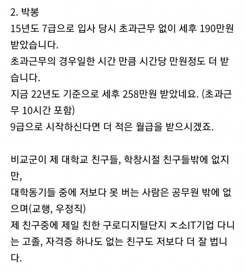 2022년 올해 기준으로는 초과 근무 10시간 포함해 세후 258만원이 통장이 찍힌다. 만일 9급으로 시작했다면 더 적은 월급을 받게 된다.