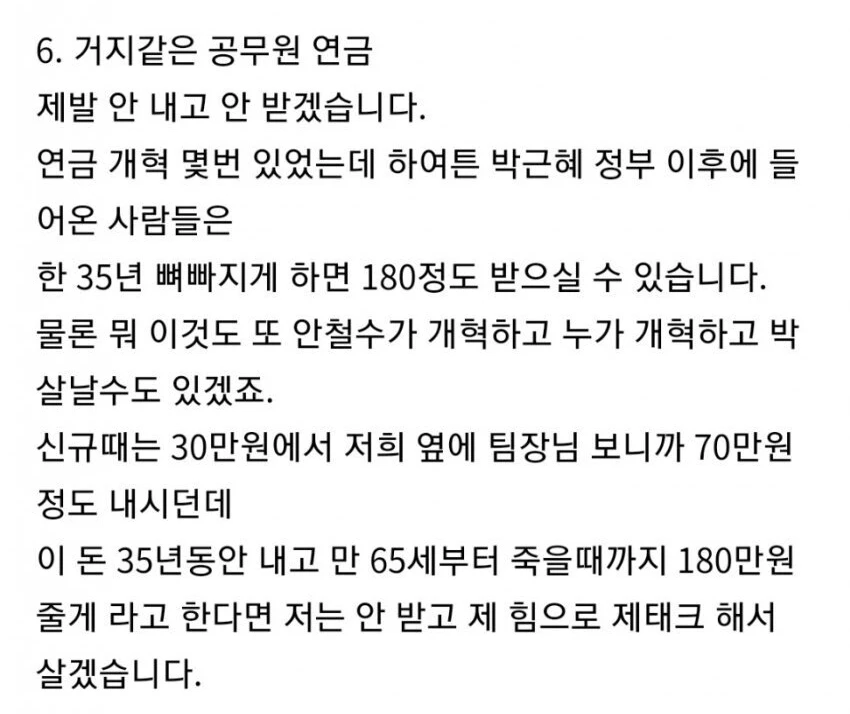 A씨는 "연금 개혁을 몇 번 해 박근혜 정부 이후에 들어온 사람들은 한 35년 뼈 빠지게 일하면 180만원 정도 받을 수 있다"며 "차라리 연금 안 받고 내 힘으로 재테크하고 살겠다"고 푸념했다.