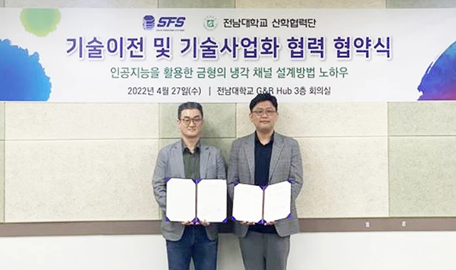 전남대학교 산학협력단(단장 민정준)은 ㈜에스에프에스(울산광역시 남구 소재)와 ‘인공지능 기반 위상최적설계를 이용한 형상 적응형 유체유동 채널 설계 방법’ 기술에 대하여 기술이전 계약 (1억원 규모)을 체결했다.