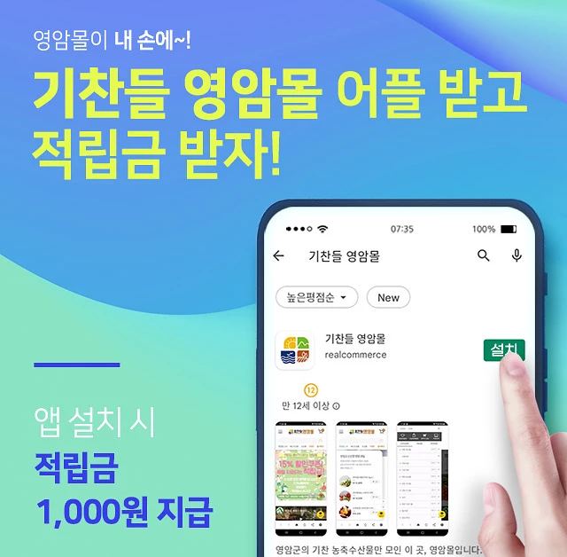 지난 5월 10일 안드로이드 플레이스토어 및 IOS 앱스토어에서 기찬들 영암몰 어플리케이션 및 앱을 다운받을 수 있으며, 다운받은 고객 전부에게 적립금 1,000원을 지급하는 이벤트를 진행한다.