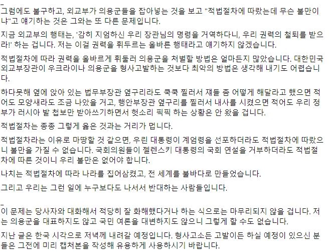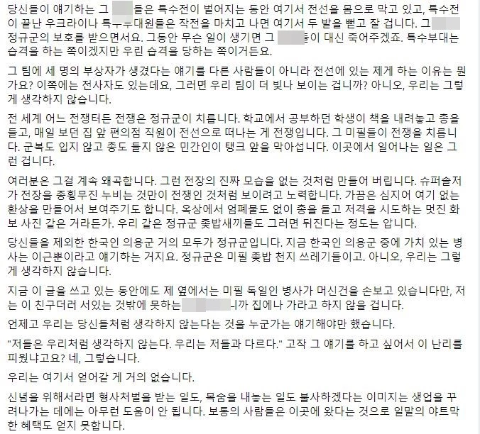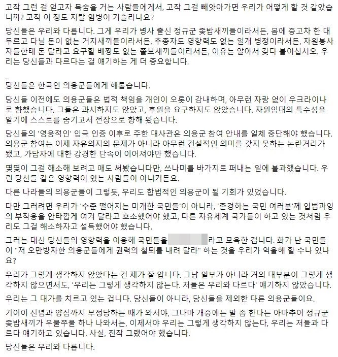 그러면서 “당신들 이전에도 의용군들은 법적 책임을 개인이 오롯이 감내하며, 아무런 자랑 없이 우크라이나로 향했다. 그들은 과시하지도 않았고, 후원을 요구하지도 않았다. 당신들의 '영웅적인' 입국 인증 이후로 주한 대사관은 의용군 참여 안내를 일체 중단해야 했다. 당신들은 영향력을 이용해 국민들을 모욕했다”고 설명했다.