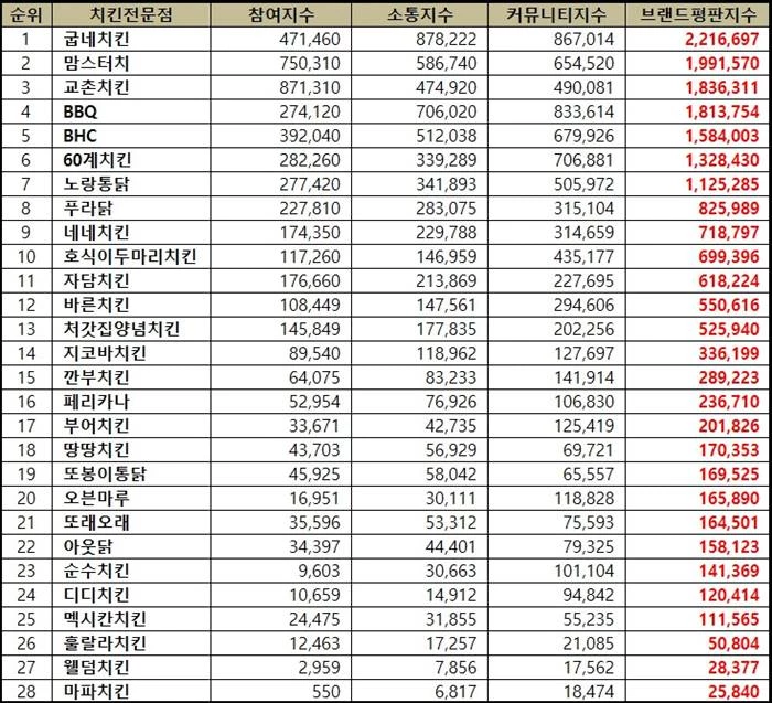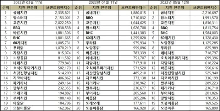 2022년 ‘5월 치킨전문점 브랜드평판' 28위까지 전체 순위는 굽네치킨, 맘스터치, 교촌치킨, BBQ, BHC, 60계치킨, 노랑통닭, 푸라닭, 네네치킨, 호식이두마리치킨, 자담치킨, 바른치킨, 처갓집양념치킨, 지코바치킨, 깐부치킨, 페리카나, 부어치킨, 땅땅치킨, 또봉이통닭, 오븐마루, 또래오래, 아웃닭, 순수치킨, 디디치킨, 멕시칸치킨, 훌랄라치킨, 웰덤치킨, 마파치킨 순으로 분석됐다.