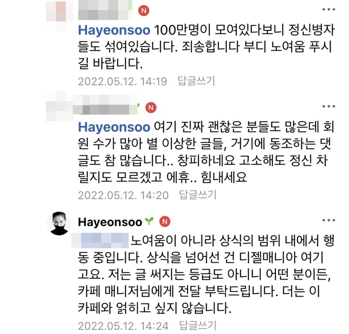 이어 그는 한 네티즌의 "노여움을 푸시길 바랍니다"라는 말에 "카페 매니저님에게 전달 부탁드립니다. 더는 이 카페와 얽히고 싶지 않습니다"라고 호소했다.