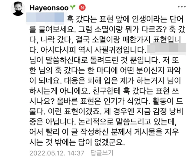 그는 "상종하기도 싫습니다. 훅 갔다느니 저렴한 표현도 소름 돋아요"라며 "본인 글은 지워주시길 바랍니다. 상처니까요"라고 글 삭제를 부탁했다. 하지만 네티즌은 그의 정중한 경고에도 반성할 태도를 전혀 보이지 않았다.