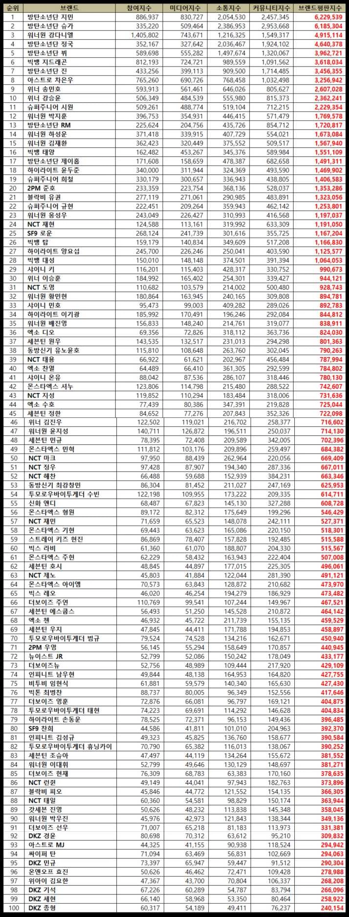 1위 지민, 2위 슈가 뒤를 이어 3위 워너원 강다니엘, 4위 방탄소년단 정국, 5위 방탄소년단 뷔 등이 차례대로 순위에 이름을 올렸다.