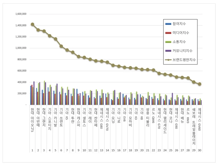한편 '5월 국산자동차 브랜드평판' 30위에는 아이오닉 5, 아반떼, 그랜저, 스포티지, 카니발, 쏘렌토, K5, 투싼, 캐스퍼, 셀토스, 레이, 싼타페, G80, GV70, 모닝, 니로, EV6, 모하비, K3, K8, 티볼리, QM6, G70, 팰리세이드, 코나, G90, 베뉴, XM3, 트레일블레이저, GV60 등이 이름을 올렸다.